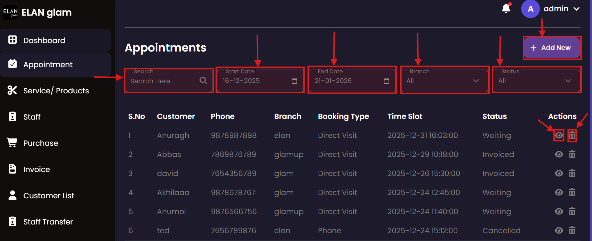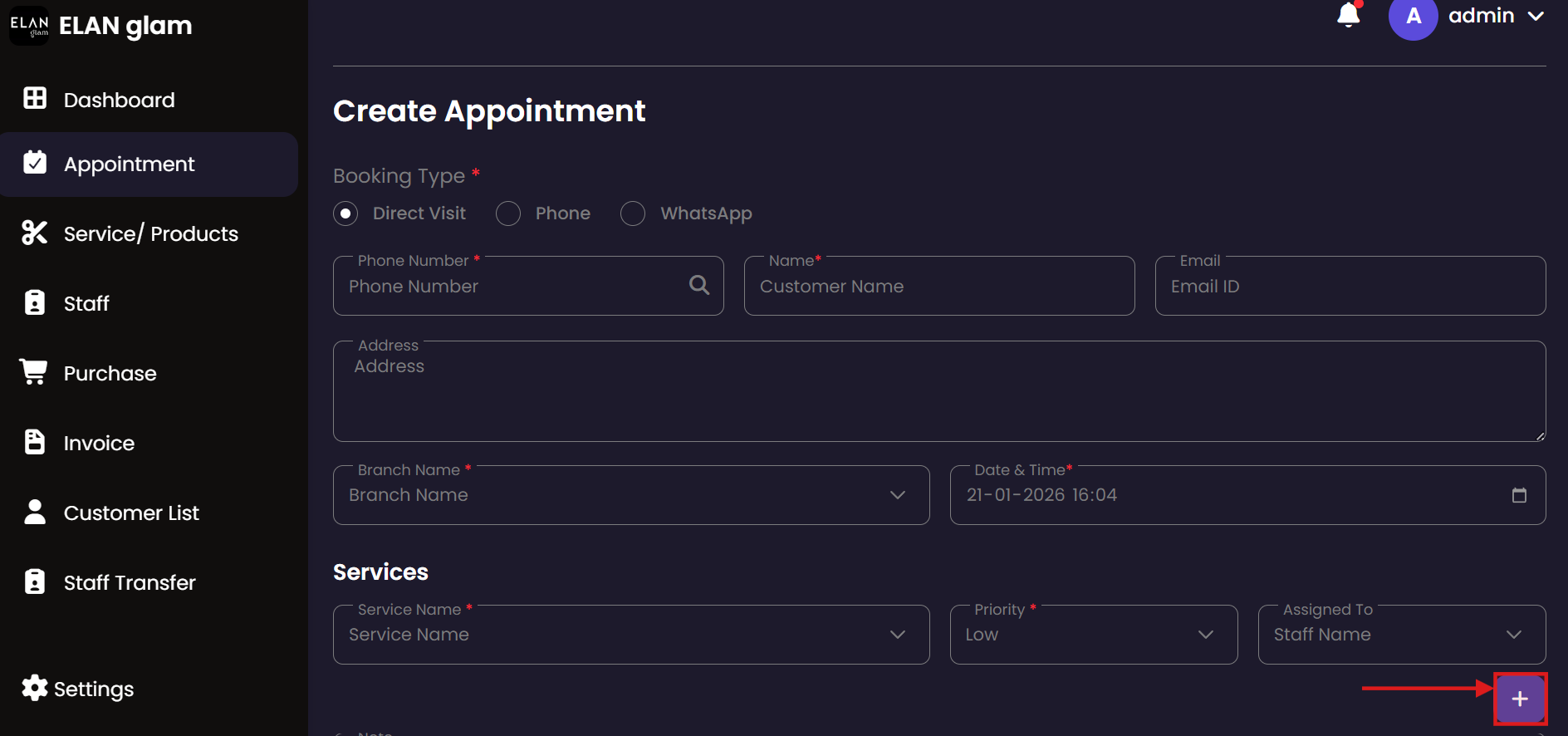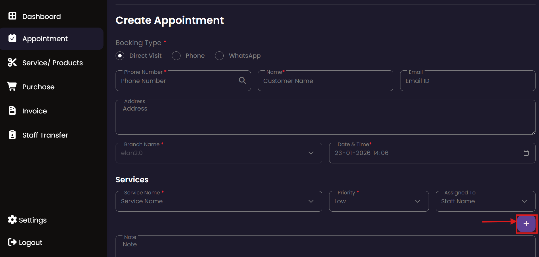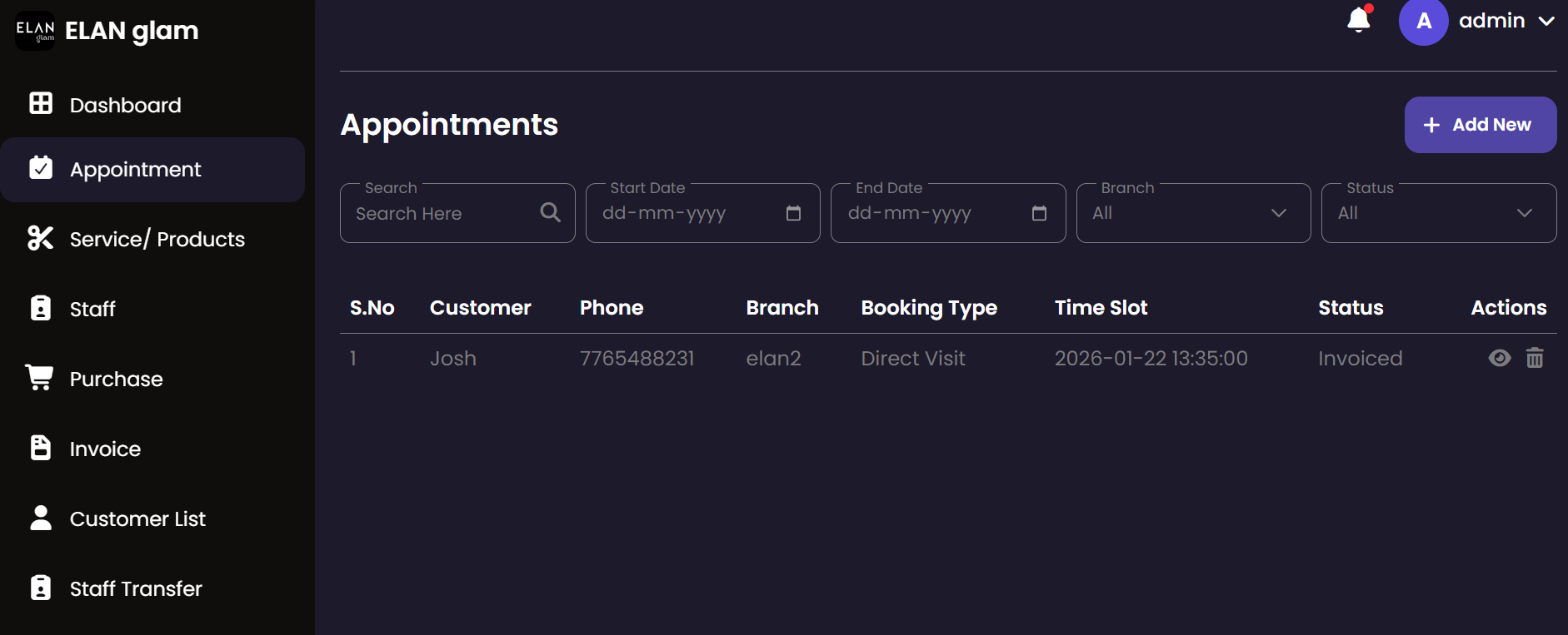 The Appointment system allows administrators to schedule, track, and manage customer bookings. It provides a centralized view of all service engagements, ensuring that staff and resources are effectively allocated across different branches.