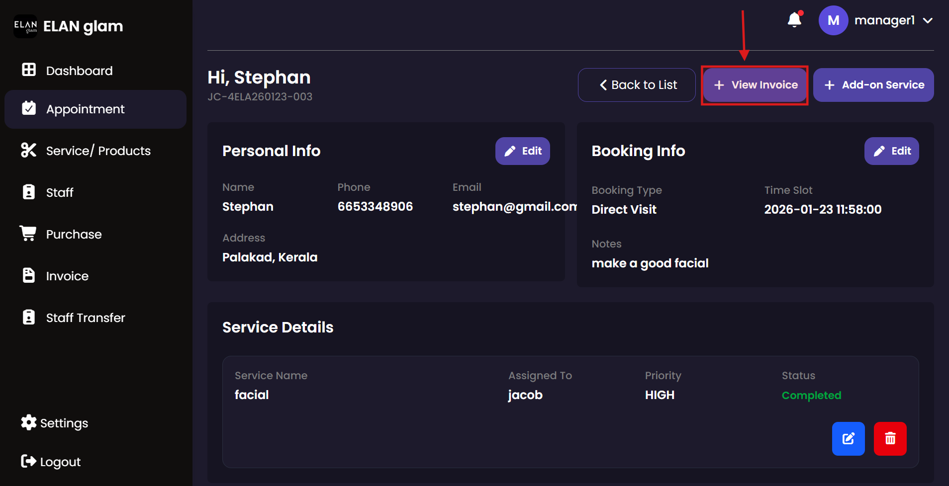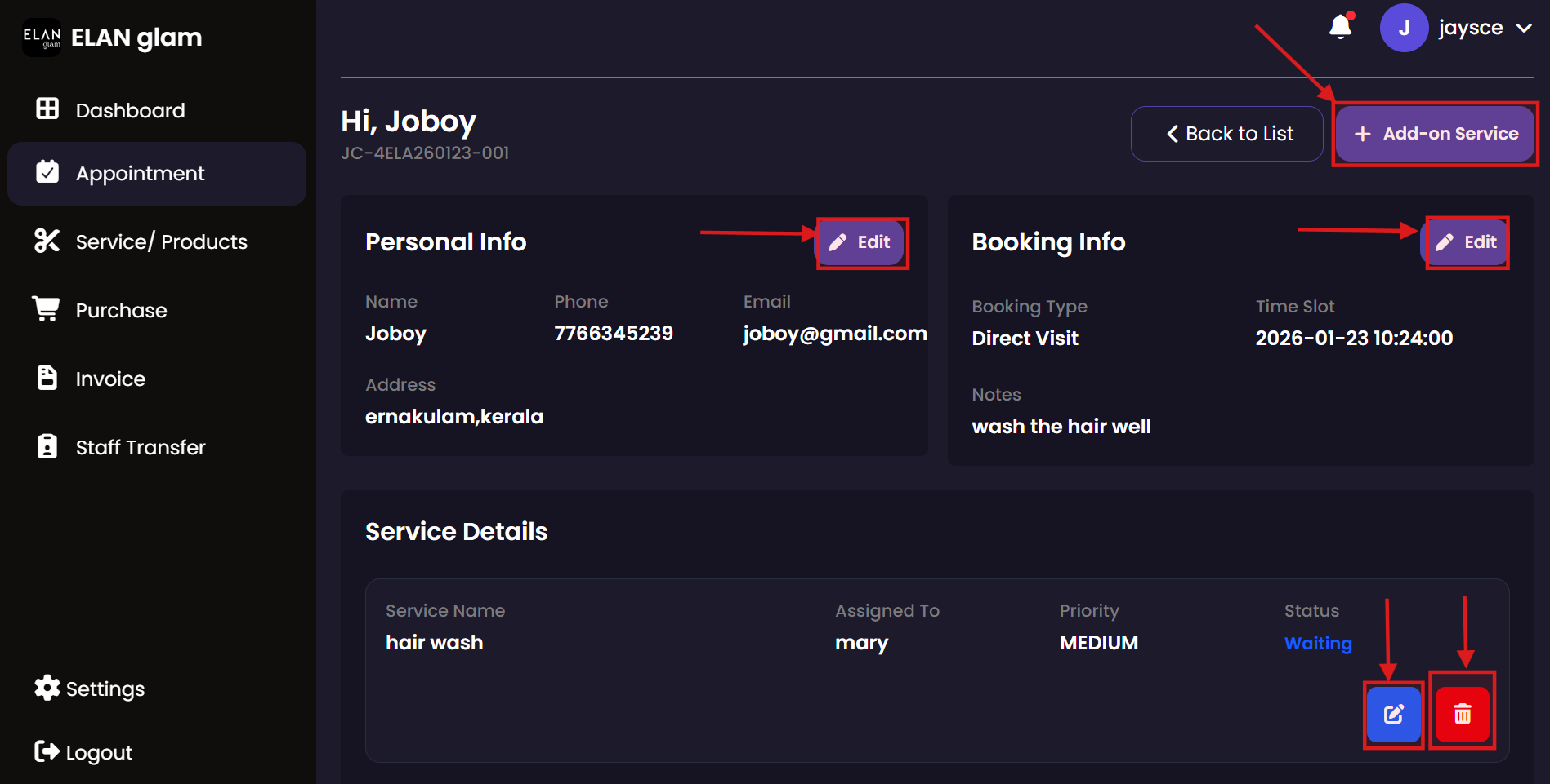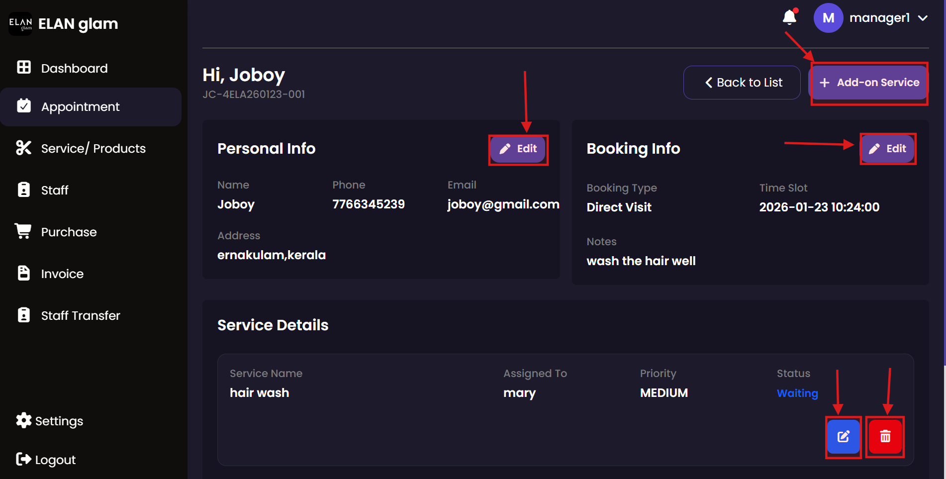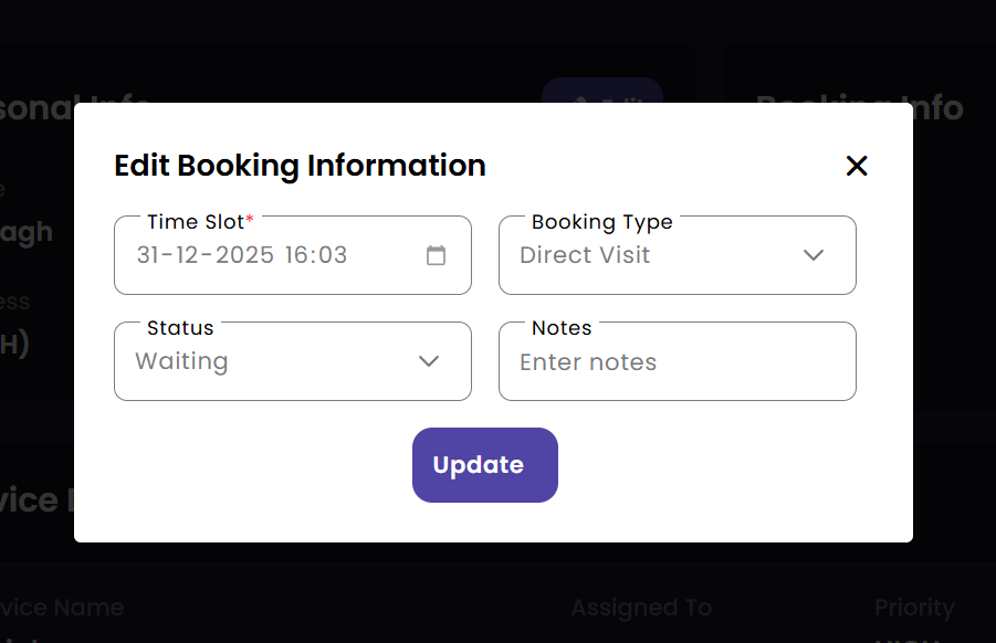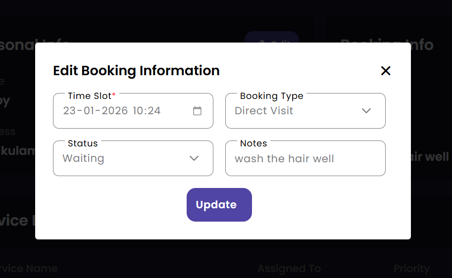 Manage the daily appointment flow at the front desk. Billing staff can quickly book new appointments for walk-in customers and update existing bookings to reflect changes in service requests or customer preferences.