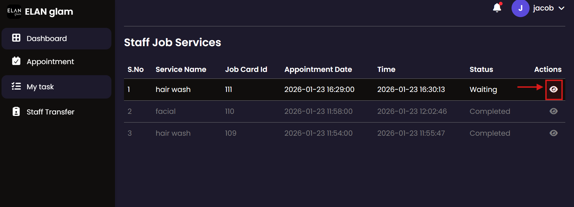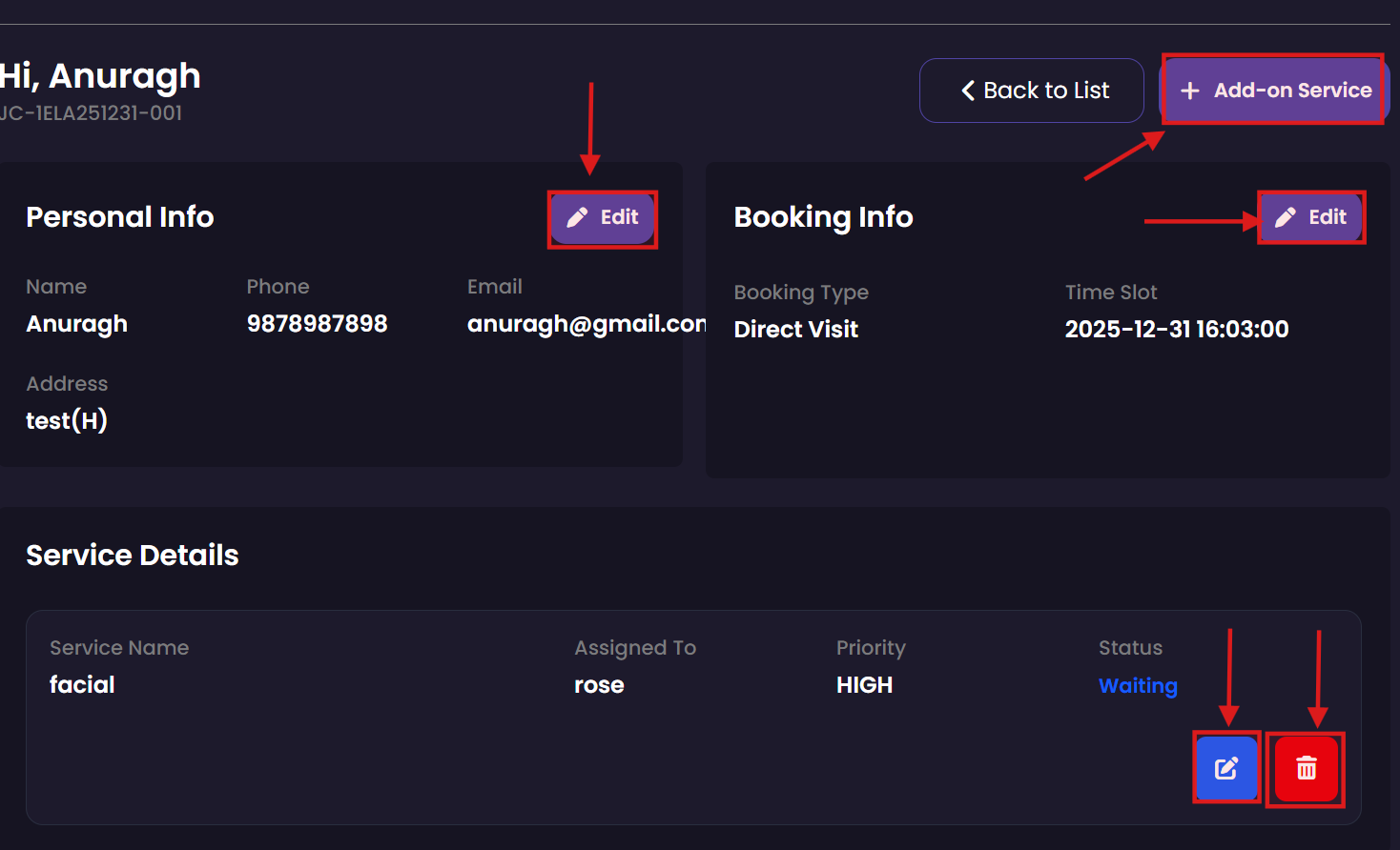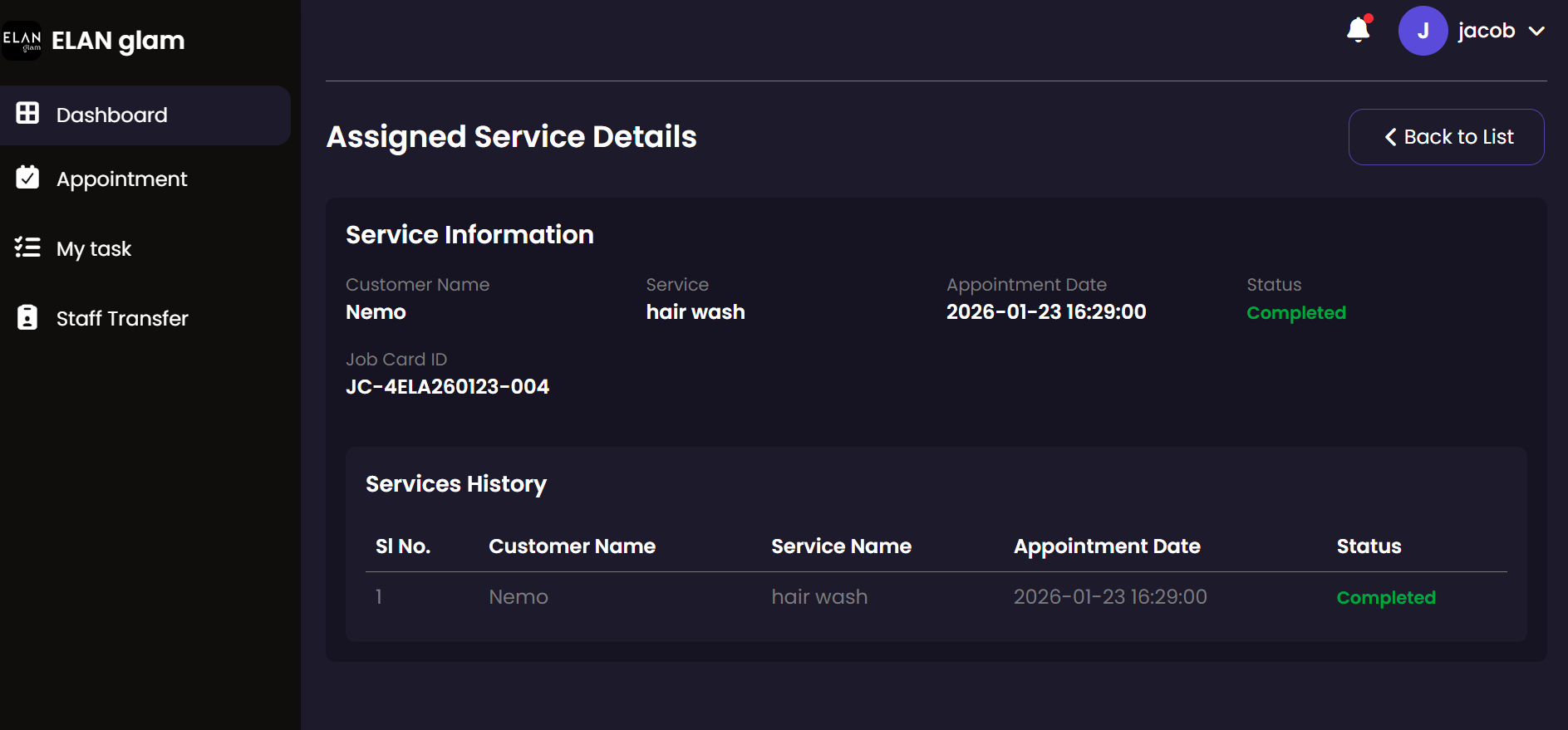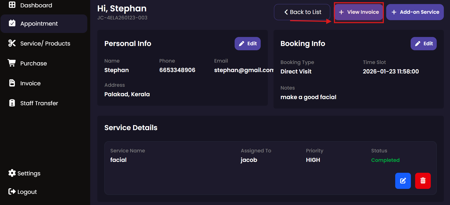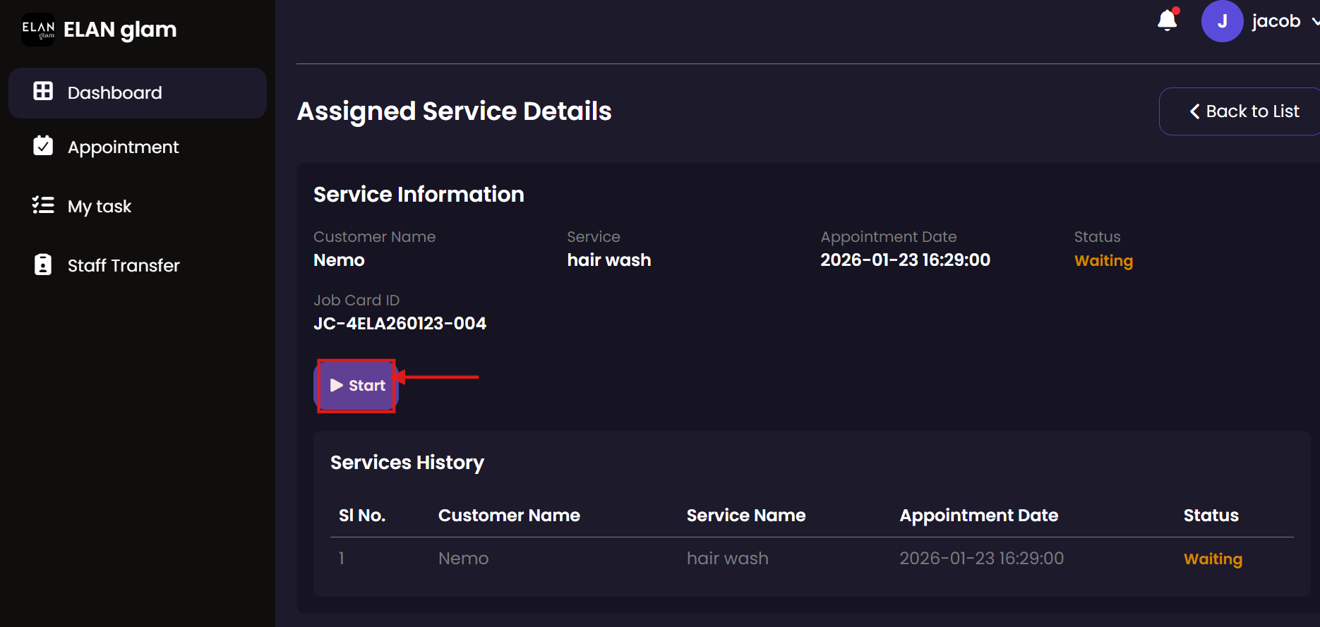 Manage your daily service tasks from start to finish. This module allows service staff to see assigned bookings, record the commencement of a service, and log the completion once the customer has been served.