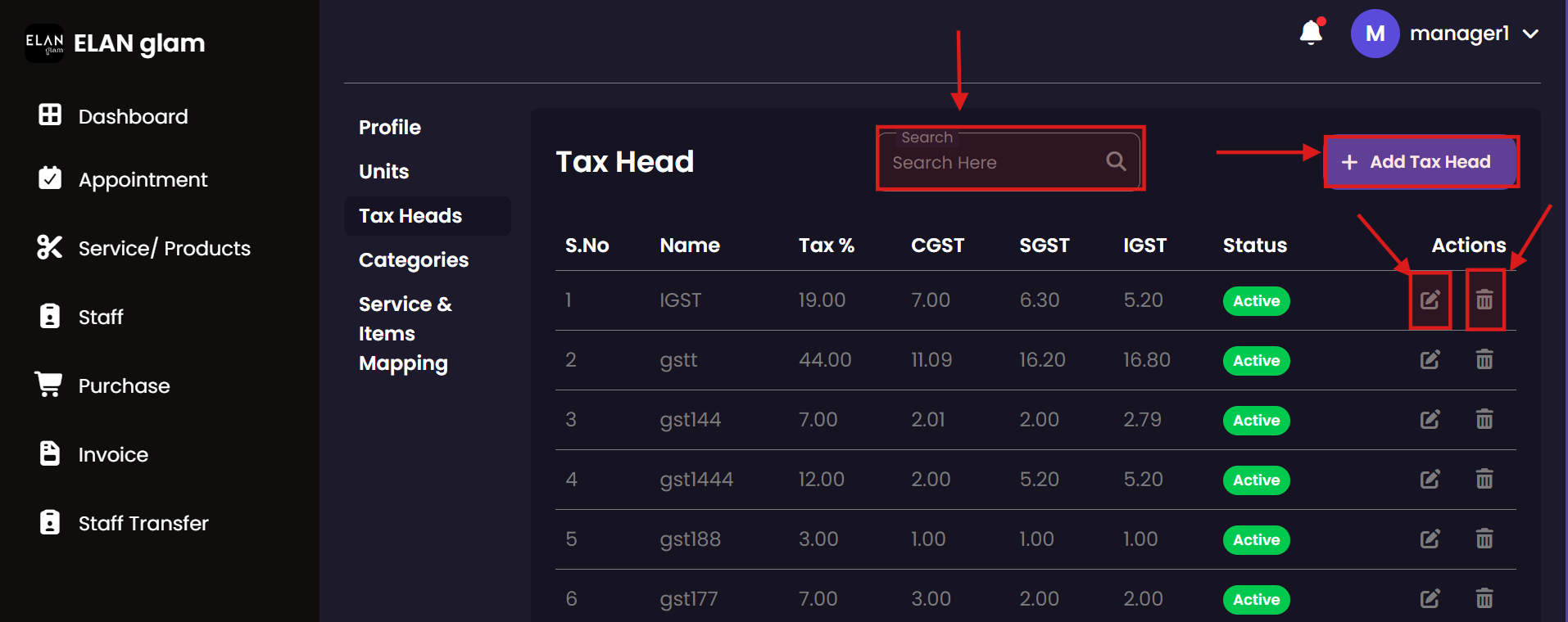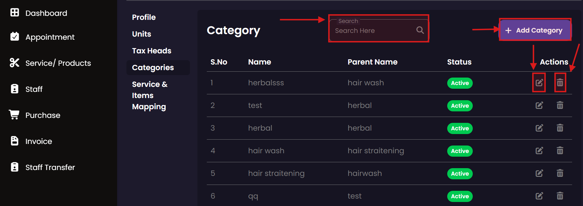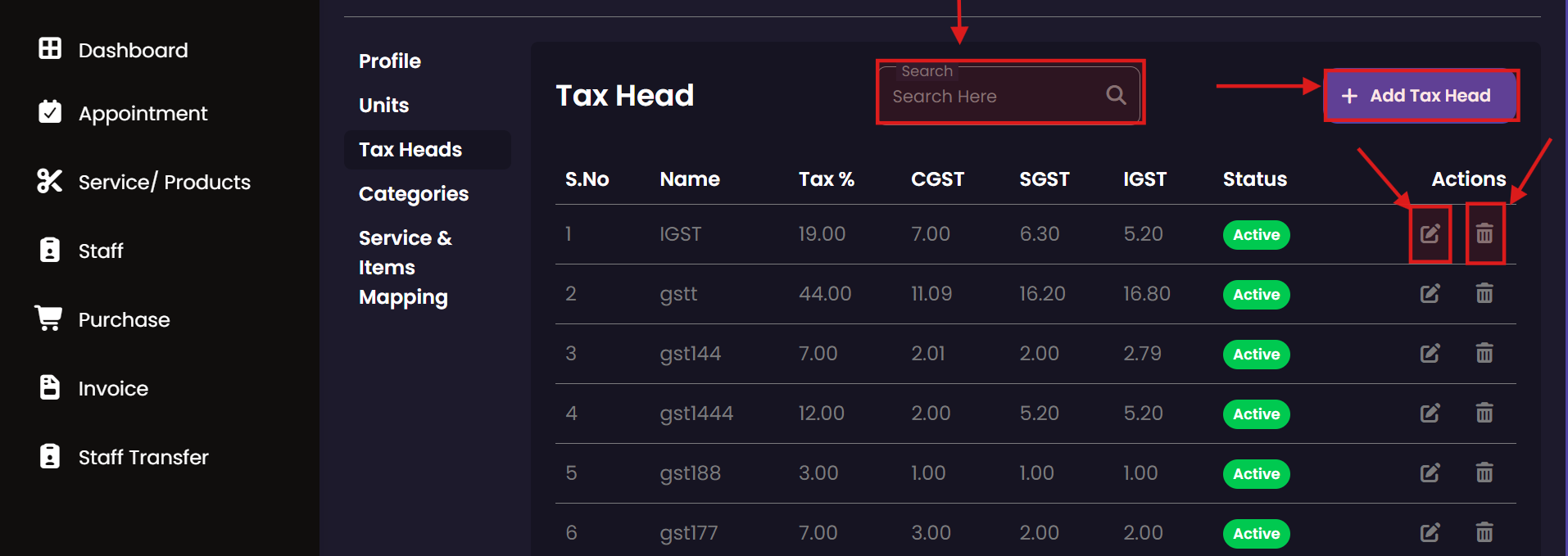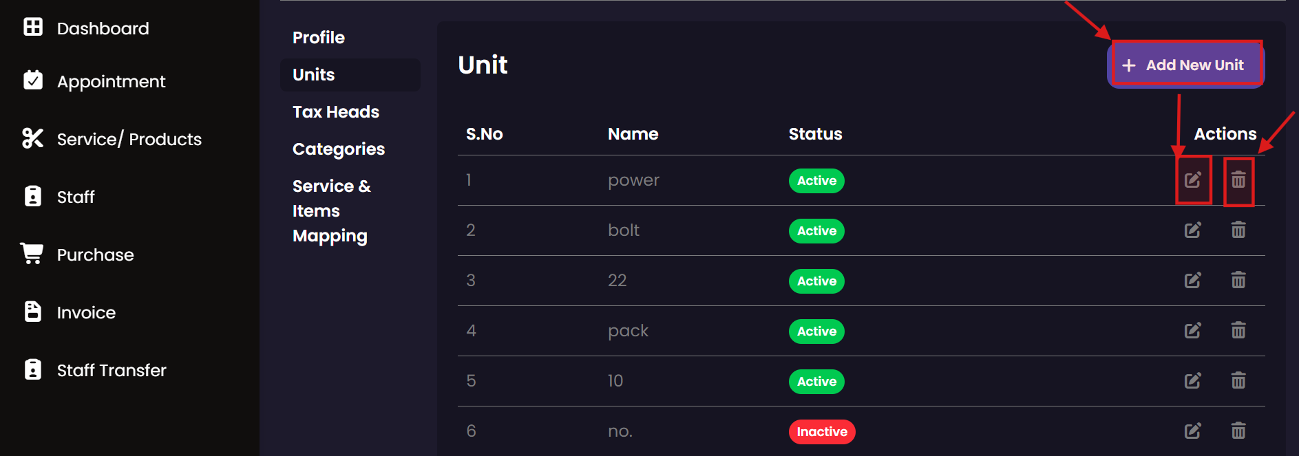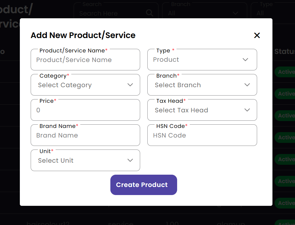 Manage the salon's inventory and service menu here. You can define what products are for sale and what services are offered to customers, including their pricing, tax implications, and associated units of measurement.