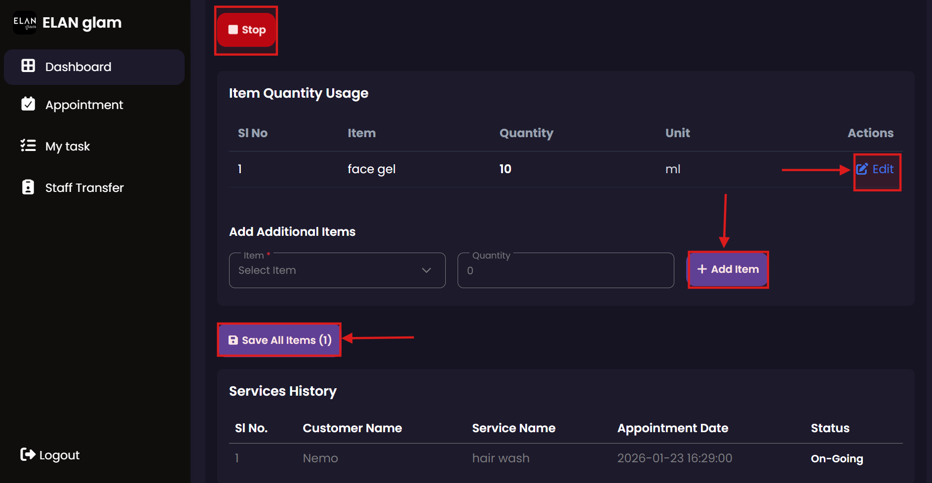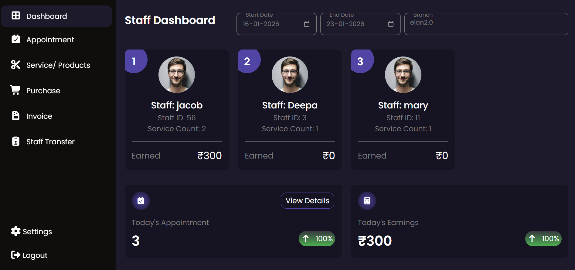 The Service Staff module is designed for the practitioners performing the salon services. Service staff can view their assigned tasks, track service duration, record product usage during treatments, and manage their daily performance.