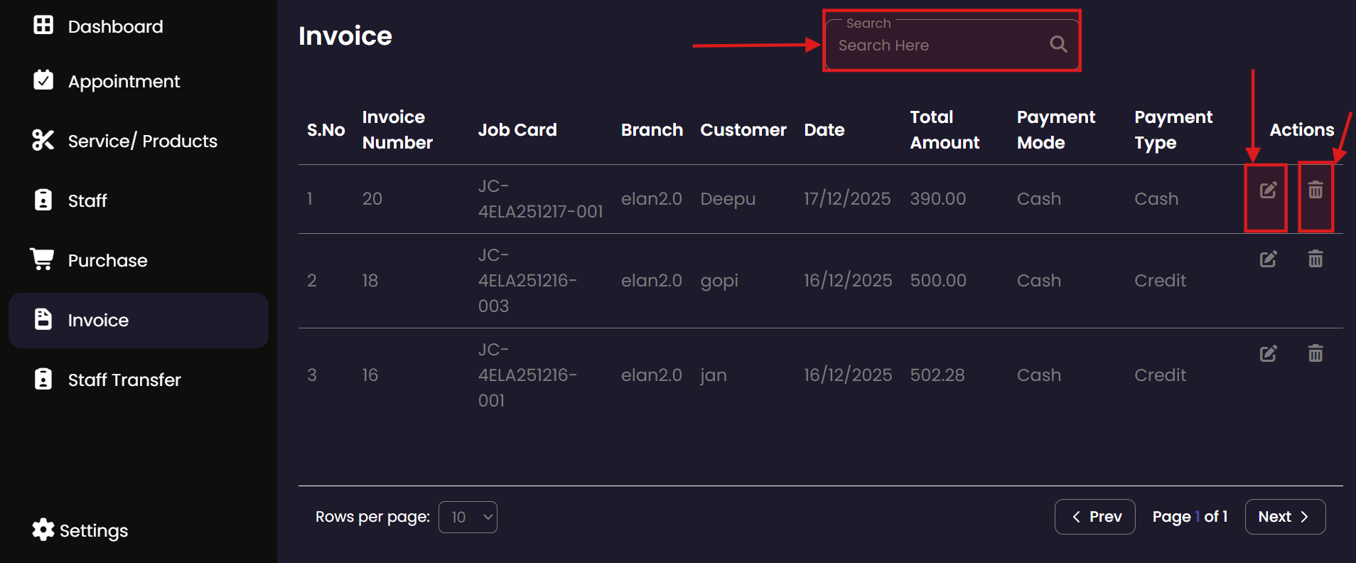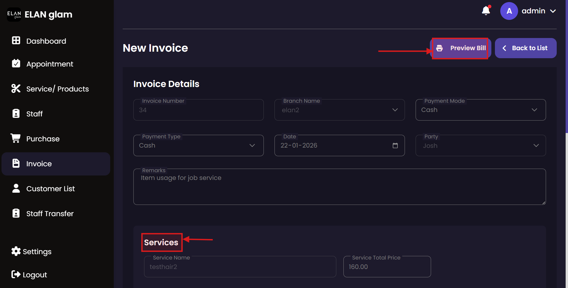 The Invoice section handles all billing activities. Administrators can generate professional invoices for completed services, manage discounts, and print physical receipts for customers. This ensures financial accuracy and transparency.