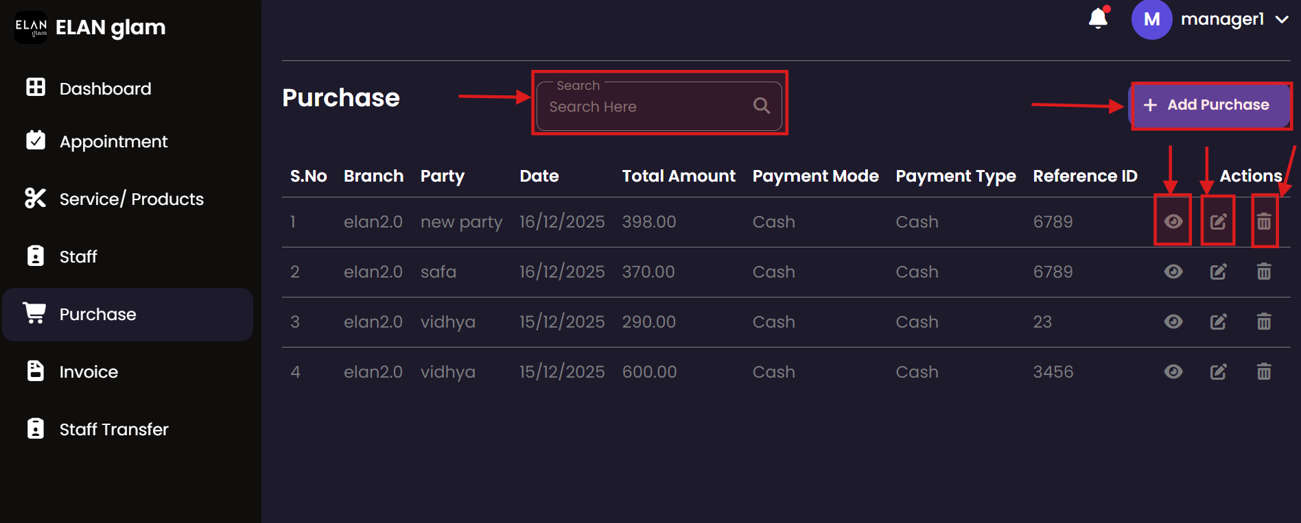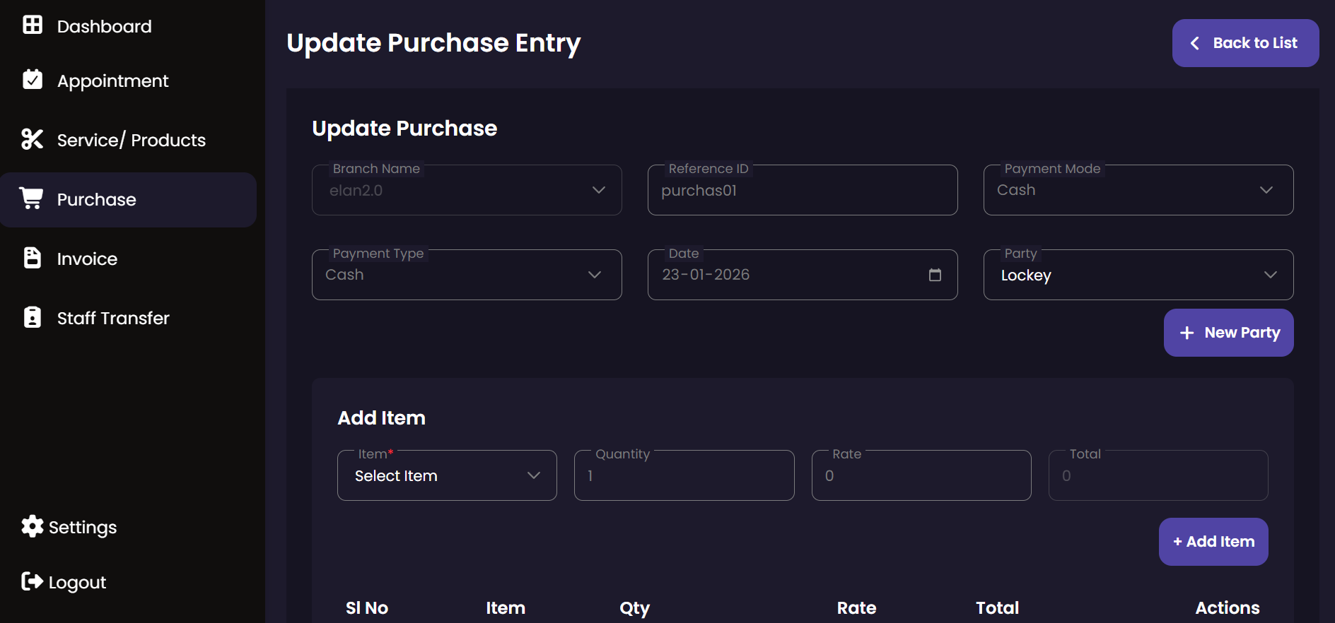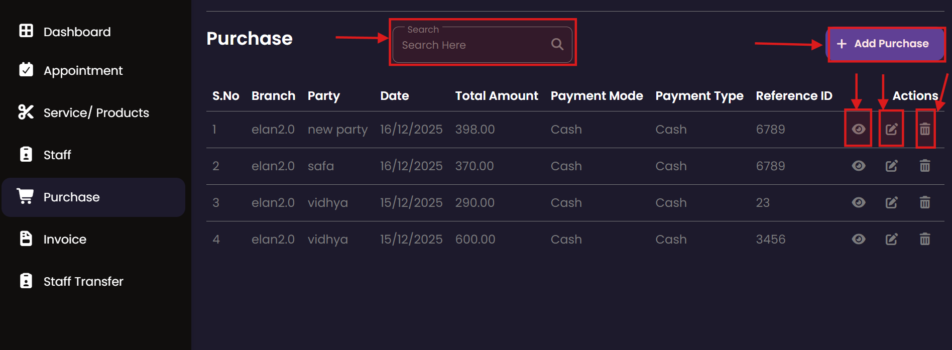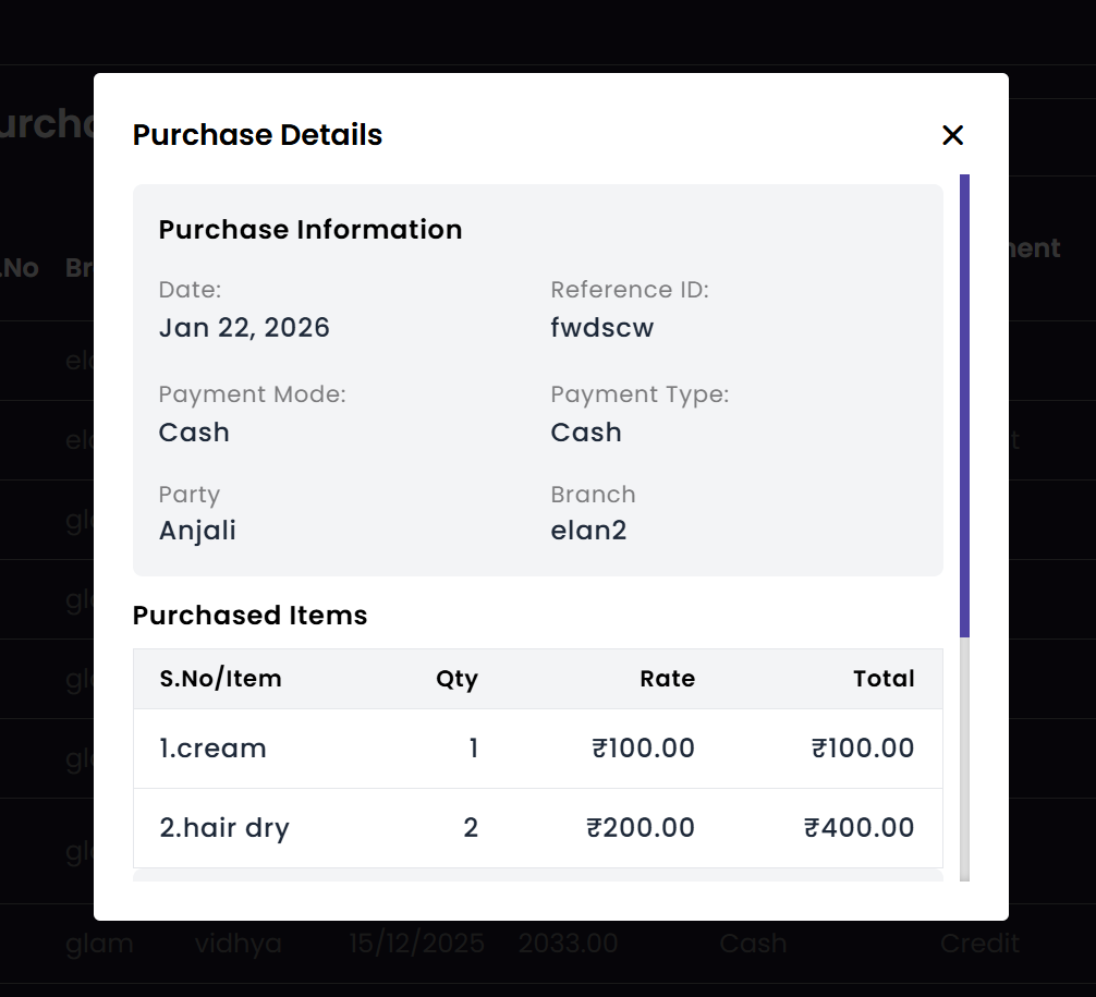 The Purchase module tracks all incoming inventory and supplies. It allows administrators to record stock acquisitions from various vendors, ensuring that the salon's inventory is always up-to-date and costs are properly logged.