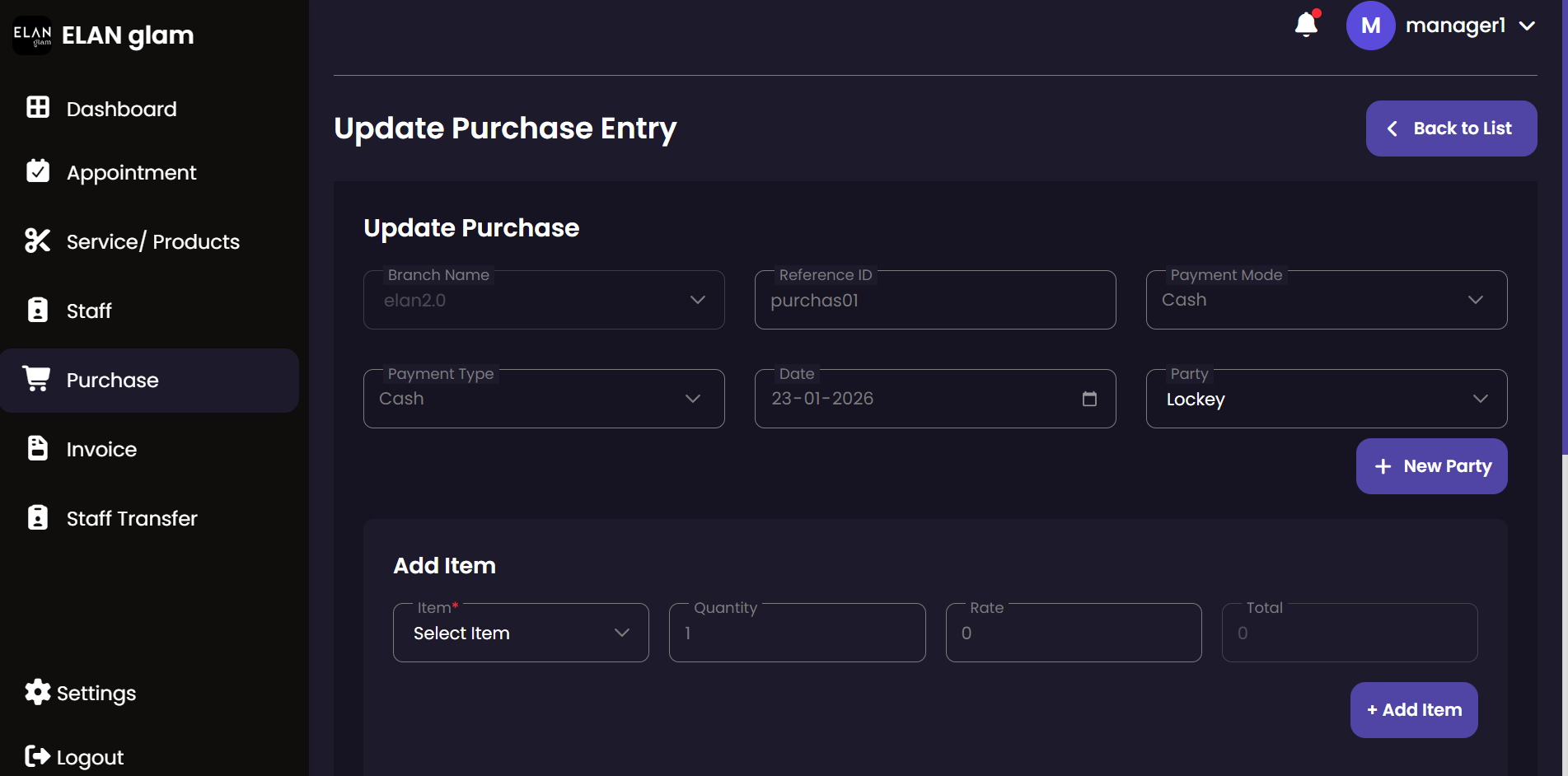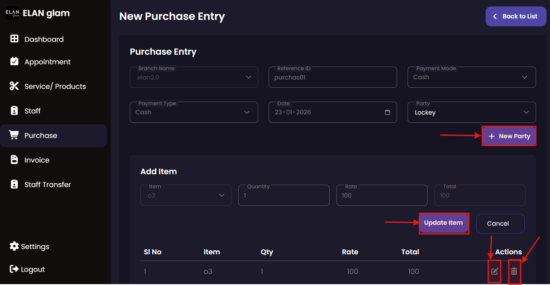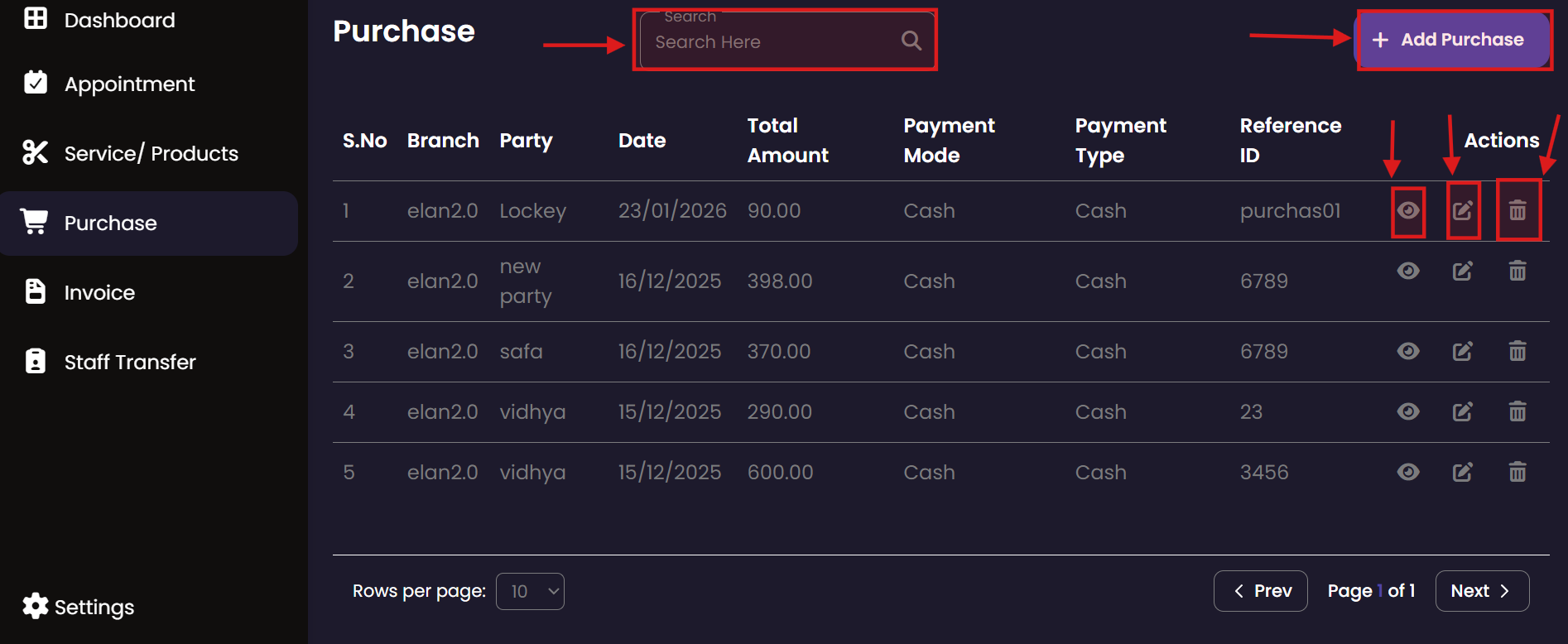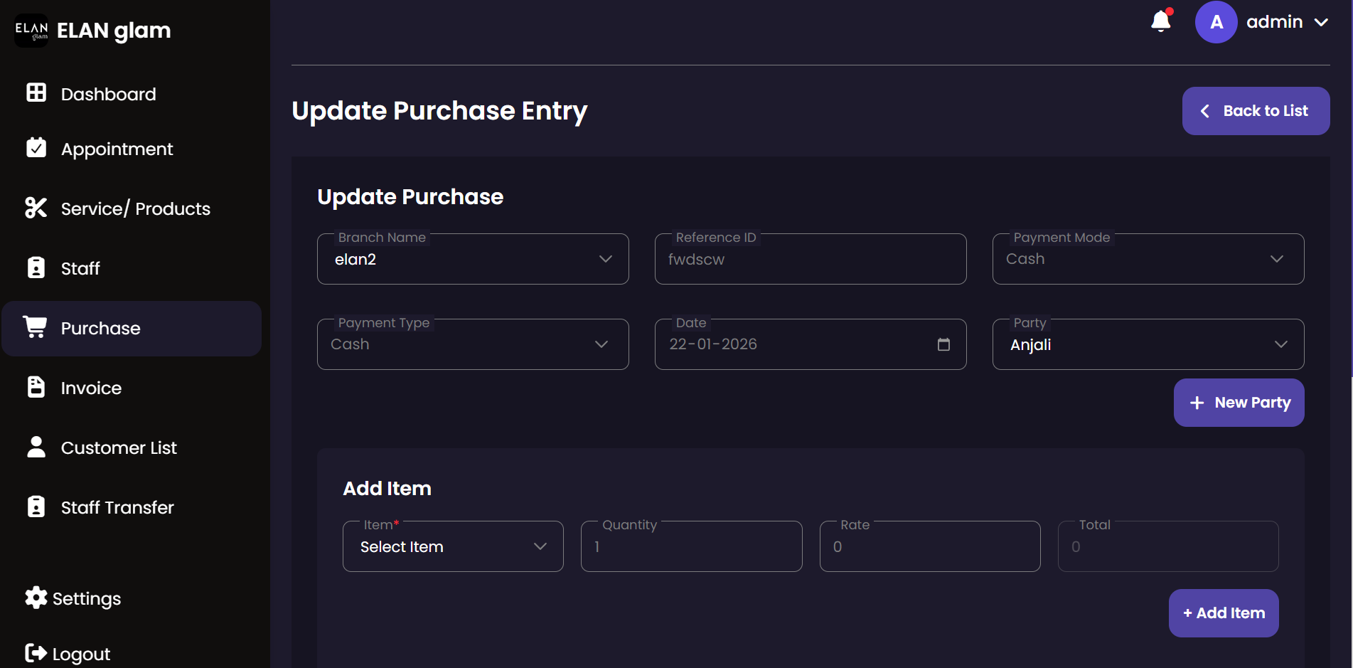 The Purchase module tracks all incoming inventory and supplies. It allows administrators to record stock acquisitions from various vendors, ensuring that the salon's inventory is always up-to-date and costs are properly logged.