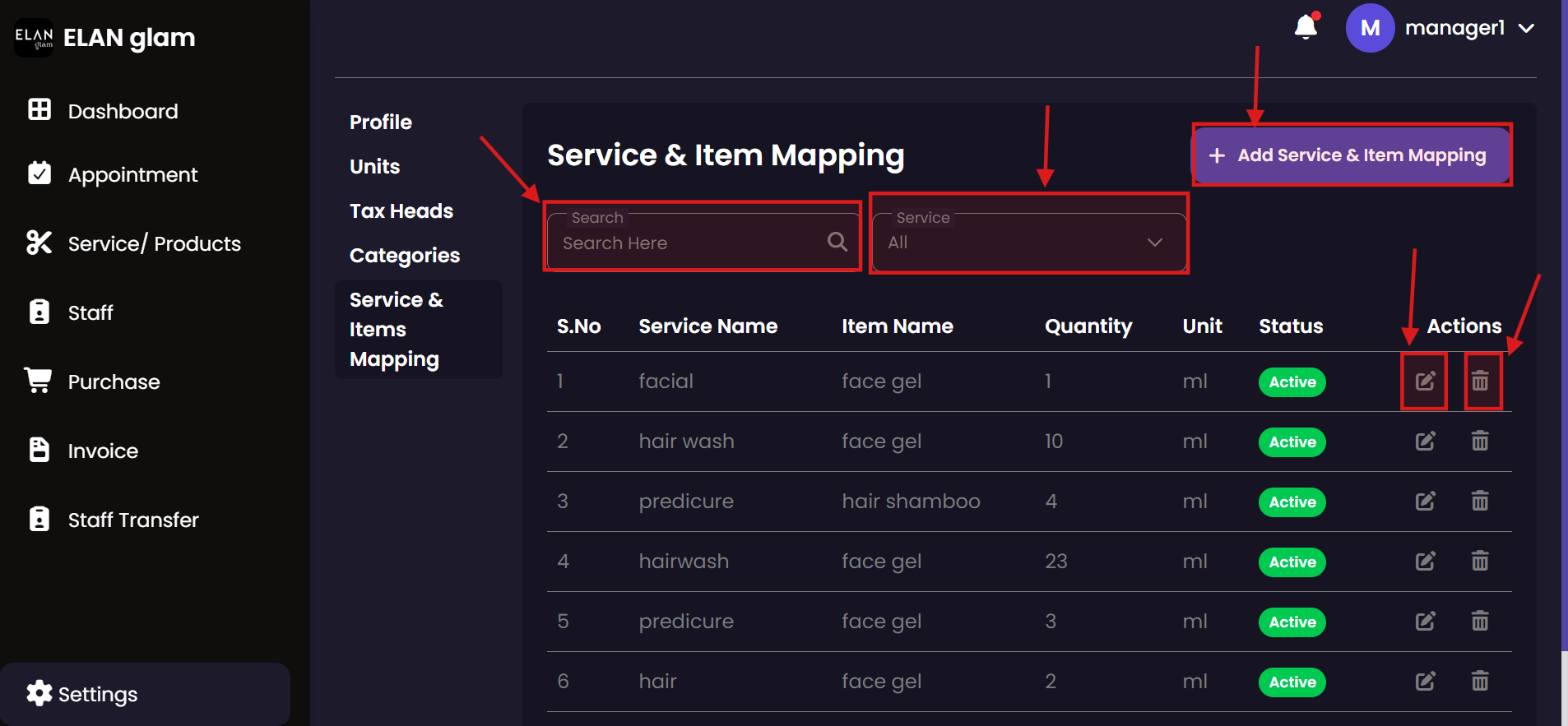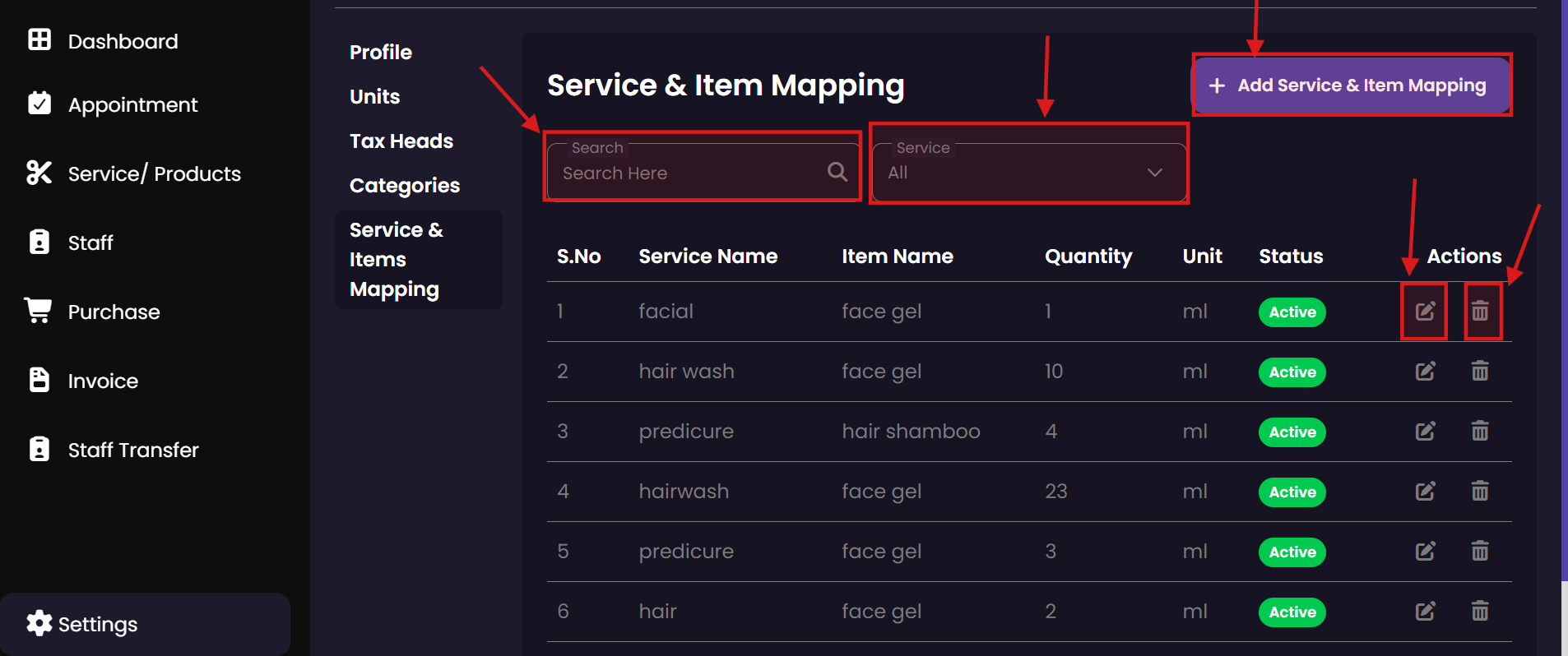 Maintain the link between services and the products required for them. This mapping helps inventory staff anticipate stock usage patterns based on the salon's appointment schedule.