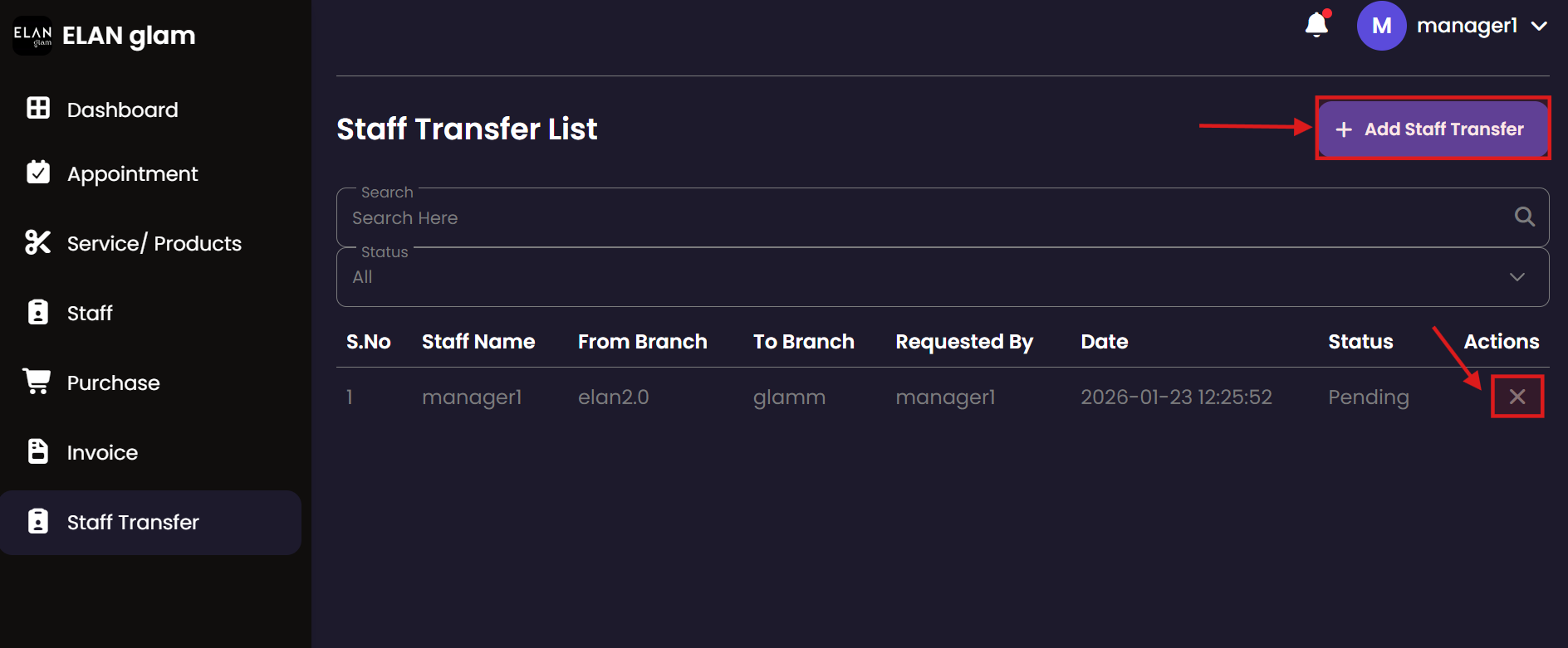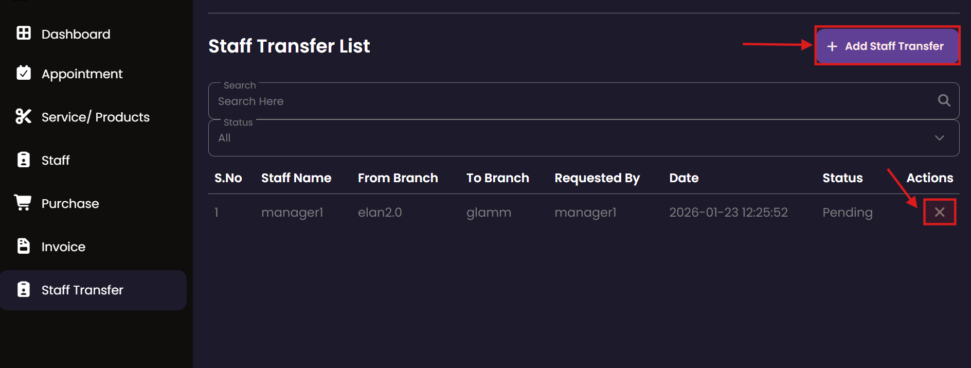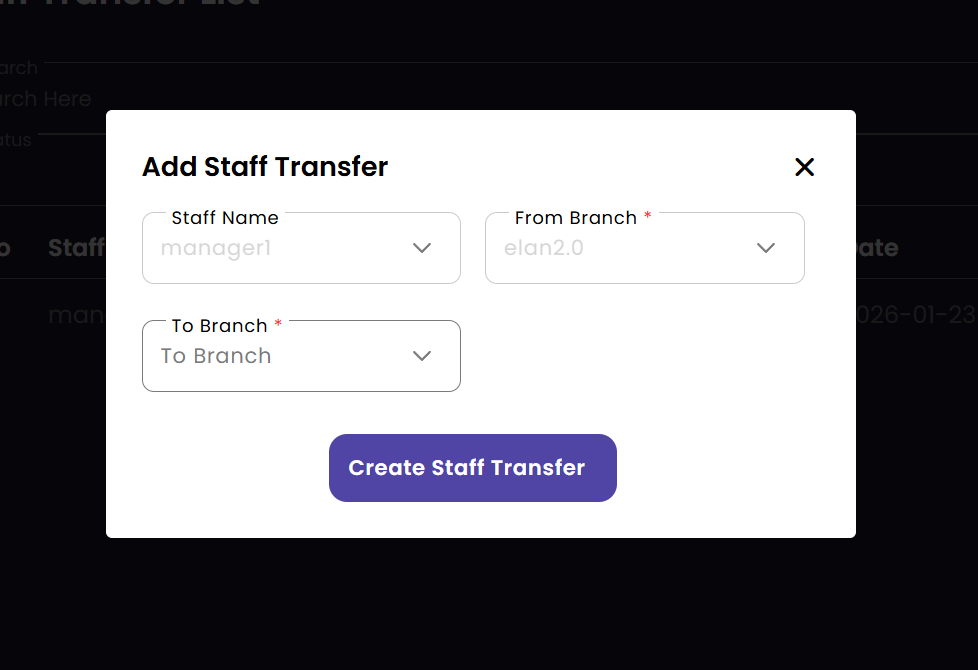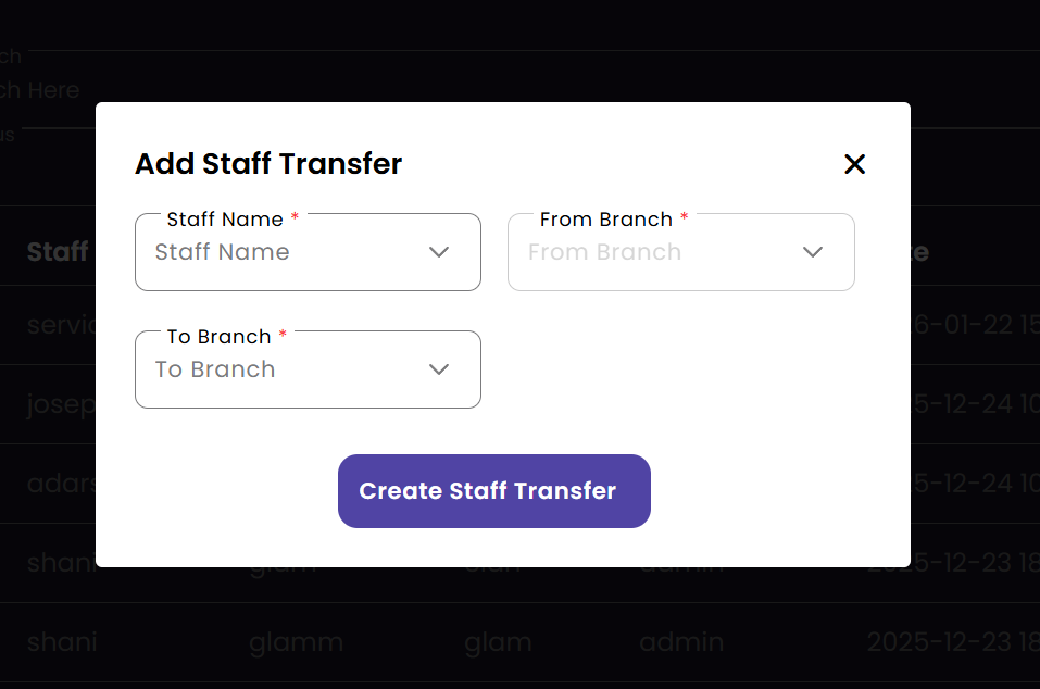Manage employee movement between different salon locations. The Staff Transfer module facilitates the temporary or permanent assignment of staff members to different branches based on operational needs.