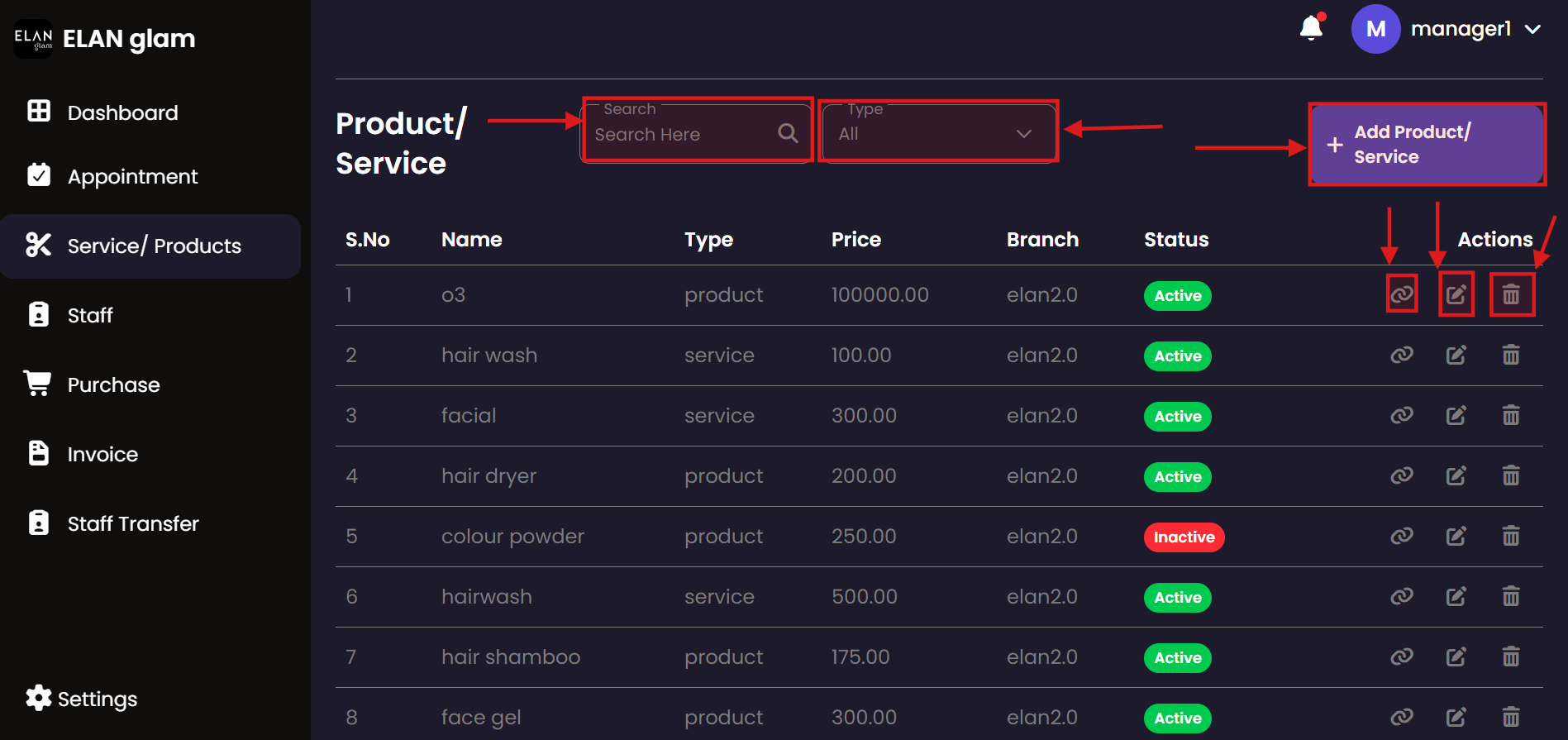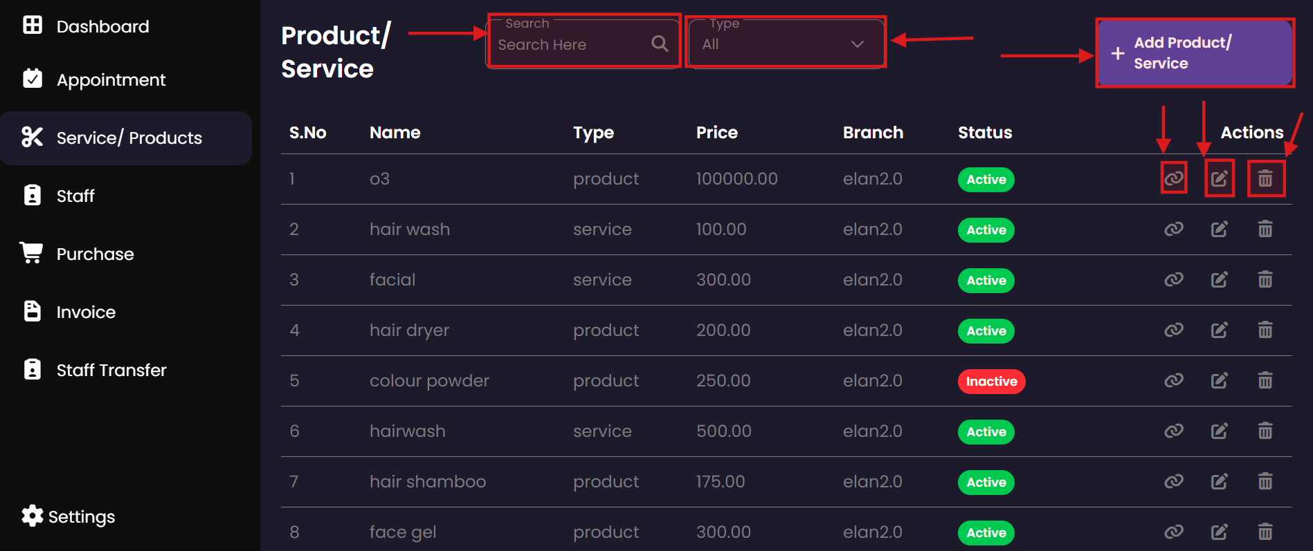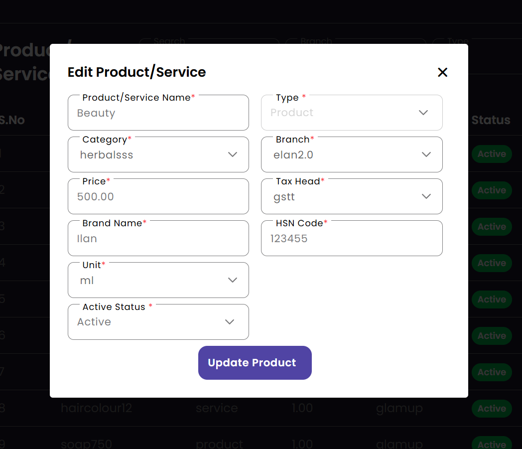 Track the products and services available in the salon's central inventory. Inventory staff can review stock levels, examine product details, and ensure that all items are correctly categorized for easy retrieval.