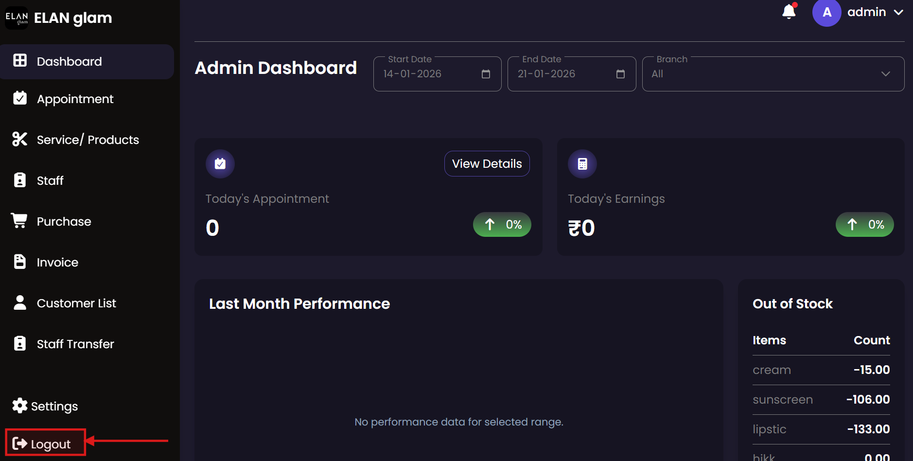 The Admin module provides full oversight of the entire salon system. Admins can manage all branches, configure core settings (taxes, units, categories), handle personnel records, and access comprehensive financial reports across the organization.