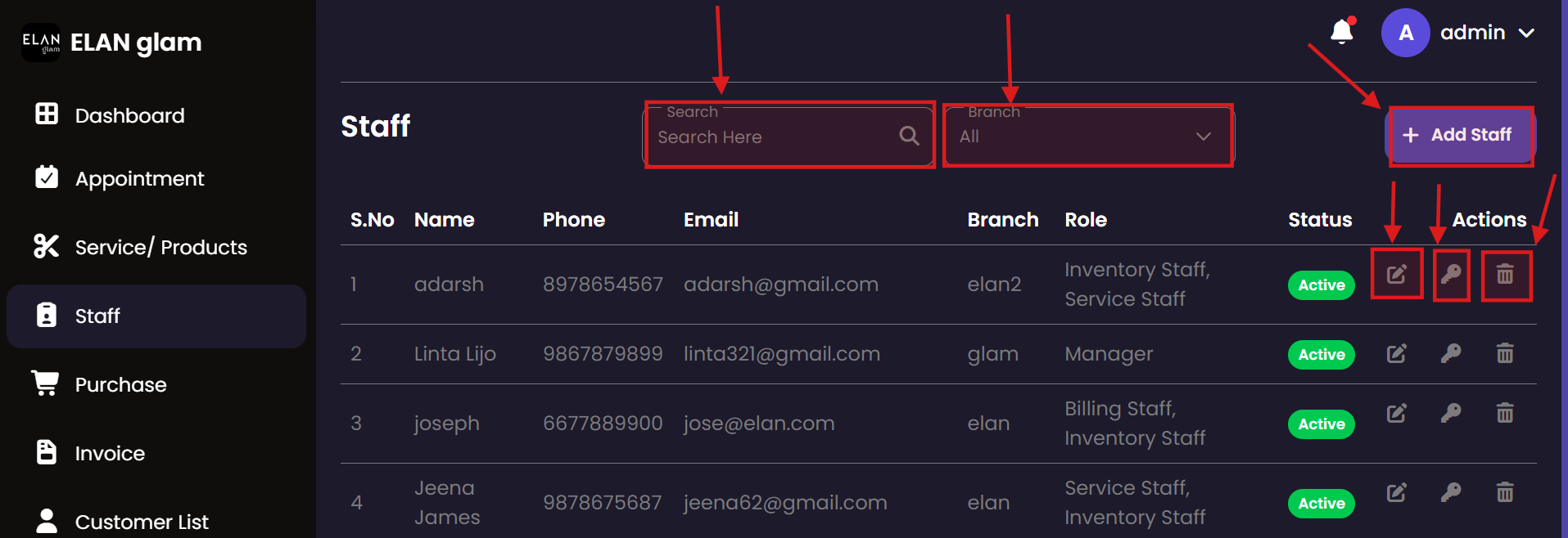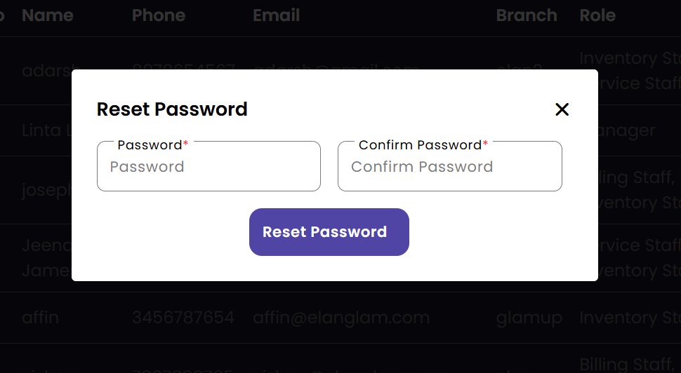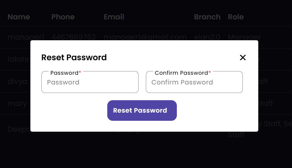 The Staff management portal allows you to maintain records for all employees. You can assign roles, manage login credentials, and ensure staff members are correctly placed within their respective branches.